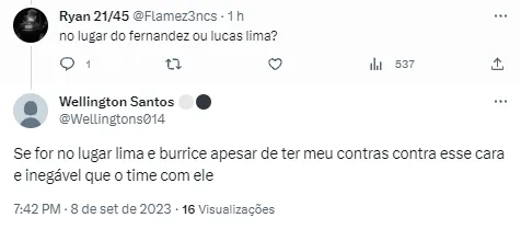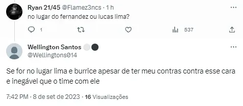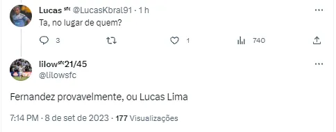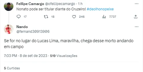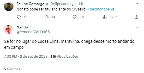 Enquanto alguns santistas gostariam de ver o craque do time no banco, até pela sequência irregular entre os titulares, outros adeptos do Peixe não acham uma boa ideia. Ainda não ficou claro quem sairá para Nonato iniciar a partida. Lucas Lima é apenas uma possibilidade dentre as alterações que Aguirre tem à disposição. No fim, os alvinegros só saberão mesmo na próxima quinta-feira (14).