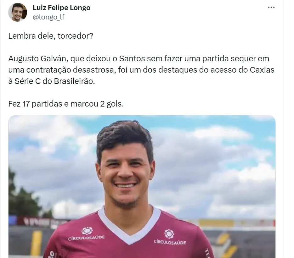 Trata-se do meia Augusto Galván, de 24 anos, que foi contratado pelo Alvinegro Praiano em 2021 junto ao Real Madrid e sequer atuou no time profissional do Clube da Vila Belmiro. O jovem, que foi revelado nas categorias de base do São Paulo, jogou apenas na equipe sub-23 do Peixe e, no fim do empréstimo, foi dispensado.