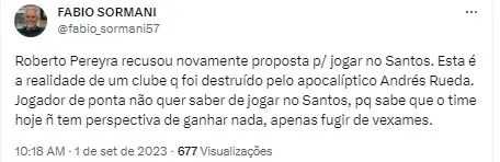 “Roberto Pereyra recusou novamente proposta para jogar no Santos. Esta é a realidade de um clube que foi destruído pelo apocalíptico Andrés Rueda. Jogador de ponta não quer saber de jogar no Santos, porque sabe que o time hoje não tem perspectiva de ganhar nada, apenas fugir de vexames”, afirmou.