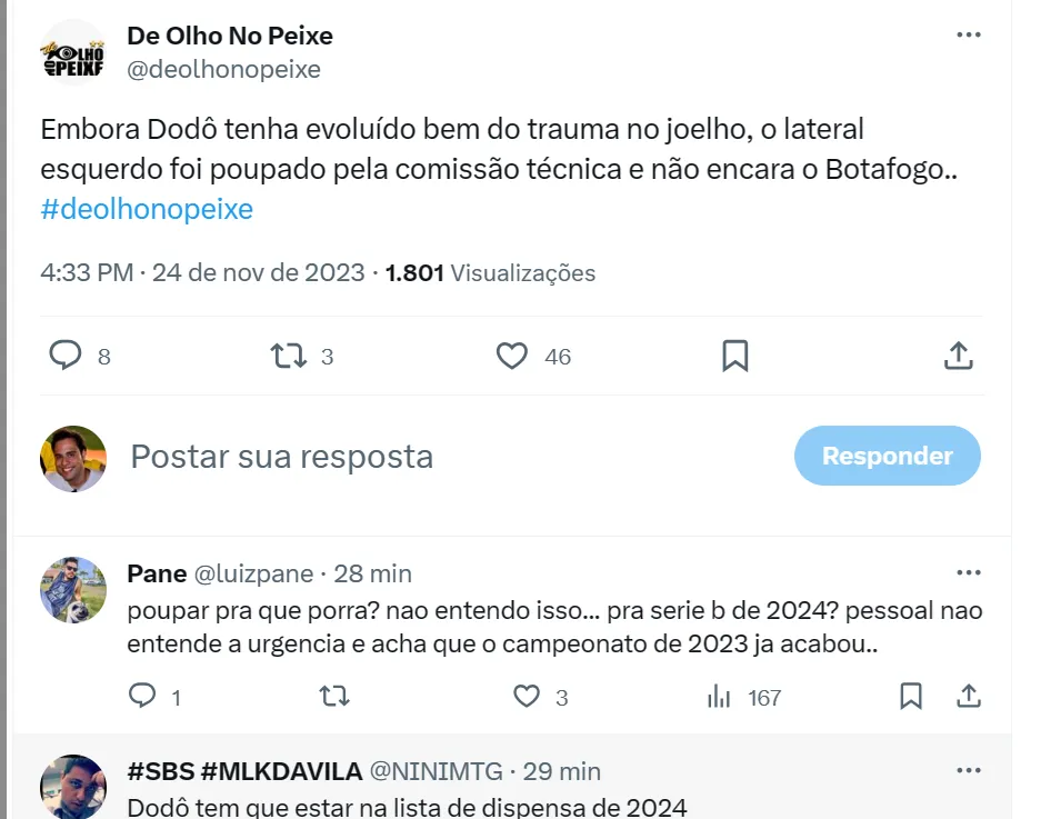 “Embora Dodô tenha evoluído bem do trauma no joelho, o lateral esquerdo foi poupado pela comissão técnica e não encara o Botafogo”, apurou a equipe do portal ‘De Olho no Peixe’.