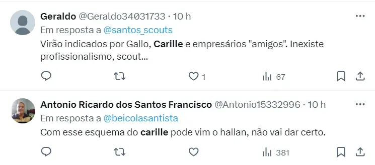 Nas redes sociais torcedores do Alvinegro Praiano pediram a saída de Alexandre Gallo e de Fábio Carille da equipe paulista. Diante da pressão que foi acontecendo, o treinador viu a necessidade de uma cobrança mais firme com os jogadores.