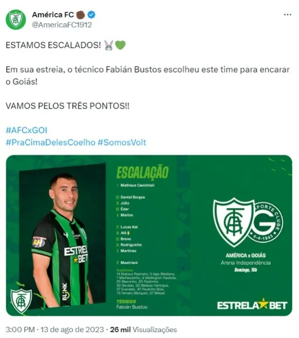 Agora, o treinador está do outro lado e esta será a primeira vez que ambos estarão “frente à frente”. Bustos chegou no América-MG há pouco tempo, até o momento, foram quatro jogos no comando do Coelho, com uma vitória em cima do São Paulo e três derrotas, para Goiás, Fluminense e Fortaleza.