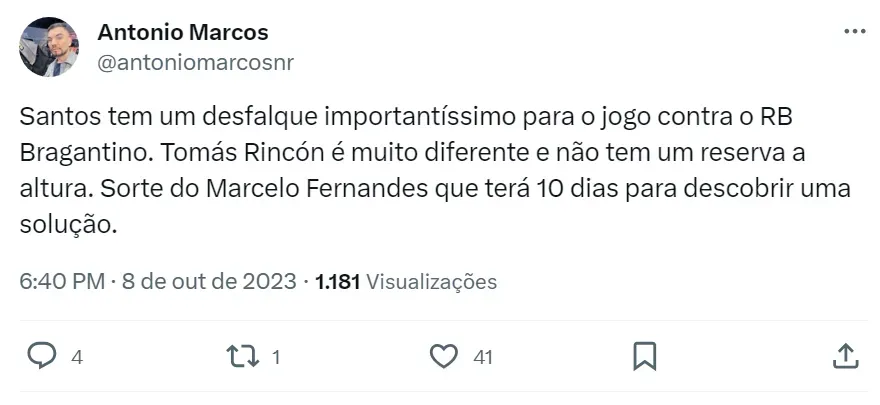 Entretanto, Marcelo Fernandes ganhou um problemão para a próxima partida do Brasileirão. O volante Tomás Rincón, que tomou conta do meio-campo do Peixe, recebeu o terceiro cartão amarelo diante do Palmeiras e desfalca o time Alvinegro contra o Red Bull Bragantino. O volante chegou ao Clube Paulista em agosto, após longa passagem no futebol europeu, e logo virou titular no time santista.
