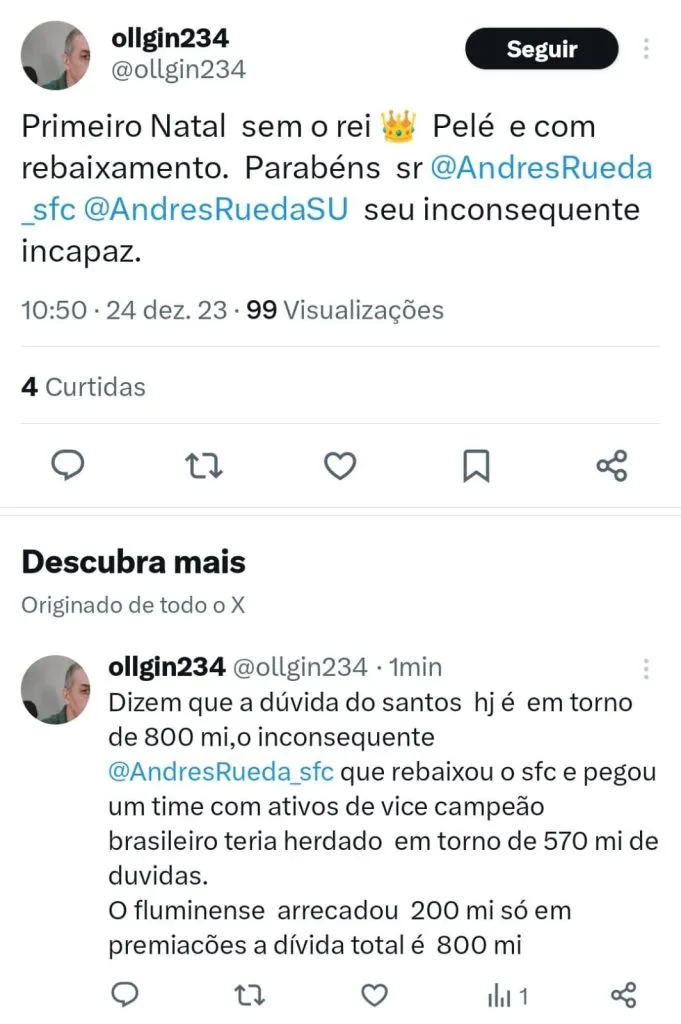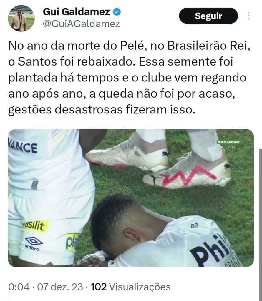 Pelé, que completa um ano de morte no dia 29 de dezembro e acabou não vendo o Santos viver um dos seus piores momentos em seus 111 anos de existência, mas de acordo com Edinho, apesar de o rebaixamento ser o ápice da crise, a situação já era esperada tendo em vista os problemas de gestão. “Não é uma coisa que aconteceu de um dia para o outro, são problemas importantes e bastante complexos”, acrescento o ex-goleiro.