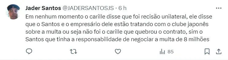 Durante coletiva após ser empossados ao cargo de presidente, na última terça-feira (19), Marcelo Teixeira revelou que apesar do Peixe não ter o dinheiro para a multa do comandante, aconteceu um acordo, mas sem dar detalhes. “O Santos não tem a menor condição de pagar multa (para liberar Carille). (…) Houve entendimento entre as partes”.
