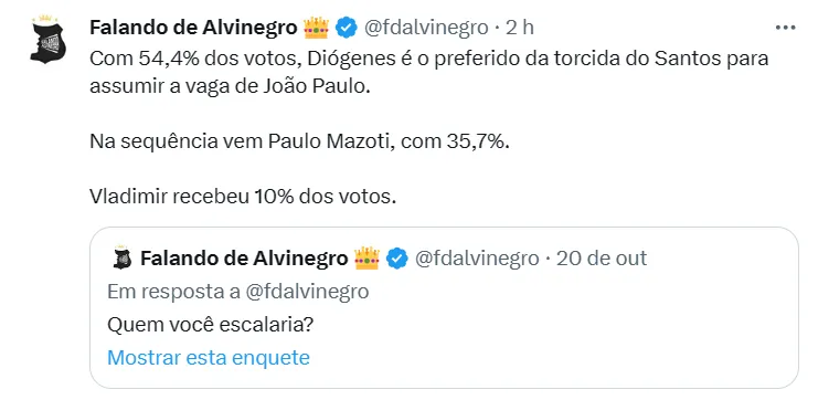 Para o gol, existe uma dúvida: Vladimir, Diógenes ou Paulo Mazoti. Essas são as opções de Marcelo Fernandes para a meta santista. Em votação proposta pelo perfil Falando de Alvinegro, no Twitter/X, Diógenes é o preferido da torcida, com 54,5% dos votos. Na sequência, vem Mazoti, com 35,7% e, por último, Vladimir, com 10% dos votos. A tendência, inclusive, é que o menos votado seja o titular.