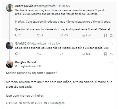 “Pretendíamos que a folha estivesse, no máximo, entre R$ 5 milhões e R$ 6 milhões, mas havia sempre não só a necessidade de reposição de um novo elenco, o que foi feito de forma muito rápida, como também negociarmos jogadores que estavam no ano passado”, completou Teixeira.