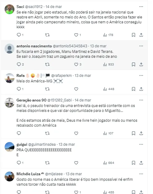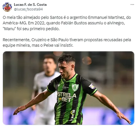 “O meia tão almejado pelo Santos é o argentino Emmanuel Martínez, do América-MG. Em 2022, quando Fabián Bustos assumiu o alvinegro, ‘Manu’ foi seu primeiro pedido”, informou Lucas Costa.