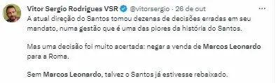 Conforme as informações de Ricardinho Martins, a multa de Marcos Leonardo para o futebol brasileiro é de 30 milhões de euros (quantia que corresponde a cerca de R$ 158 milhões na cotação atual). A tendência é que o camisa 9 santista vá para a Europa no ano que vem.