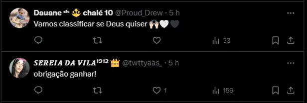 Dessa forma, o Santos precisa garantir a classificação para a próxima fase. Nas quartas de final, o time recebe a Portuguesa. O confronto ocorre neste domingo (17), às 20h15, na Vila Belmiro.