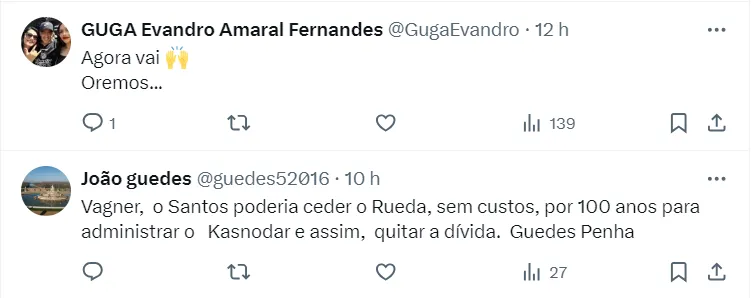 “Krasnodar está avaliando essa possibilidade e talvez o Santos consiga quitar essas dívidas apenas com os direitos econômicos de alguns jogadores. Talvez tenha que dar tudo em dinheiro, isso está sendo negociado. Santos elaborou uma proposta e agora está nas mãos do clube russo”.