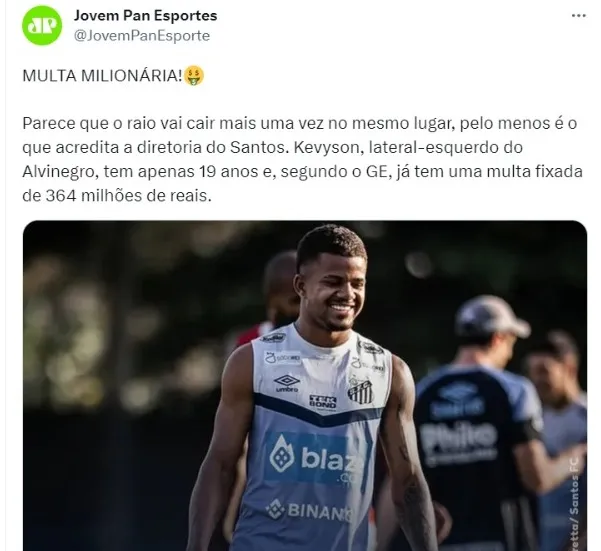 Sendo um dos grandes destaques do sub-20, a diretoria do Peixe fechou um novo contrato com Kevyson até dezembro de 2026, com aumento salarial, e o principal. Hoje, o Santos está bem resguardado contra o assédio de equipes da Europa em mais uma de suas joias.