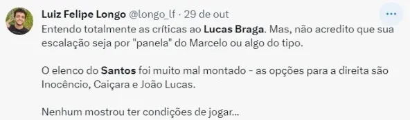 O Santos pretende faturar algo em torno de R$ 30 a R$ 40 milhões na negociação com o jogador. Natural de São Paulo, Braga chegou ao Santos no início em 2019 vindo do Luverdense.