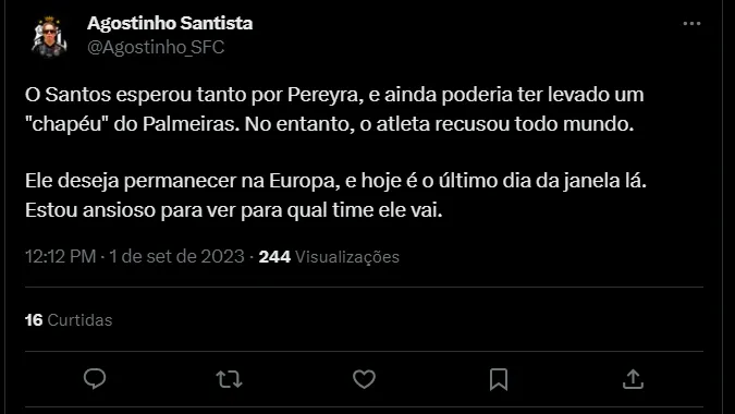 Hoje (1), fecha a janela de transferências nas principais ligas europeias. Pereyra queria seguir atuando na Itália, porém só recebeu a possibilidade de jogar a segunda divisão no país, o que acabou sendo prontamente recusado. Os mercados alternativos, como MLS e Arábia Saudita, além do Brasil, seguem sendo alternativas para o argentino.