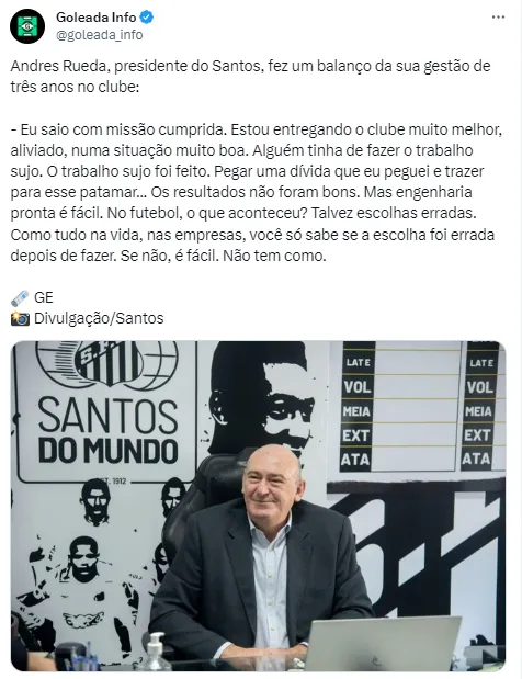 “Eu saio com missão cumprida. Estou entregando o clube muito melhor, aliviado, numa situação muito boa. Alguém tinha de fazer o trabalho sujo. O trabalho sujo foi feito. Pegar uma dívida que eu peguei e trazer para esse patamar… Os resultados não foram bons. Mas engenharia pronta é fácil. No futebol, o que aconteceu? Talvez escolhas erradas. Como tudo na vida, nas empresas, você só sabe se a escolha foi errada depois de fazer. Se não, é fácil. Não tem como”, afirmou Rueda.
