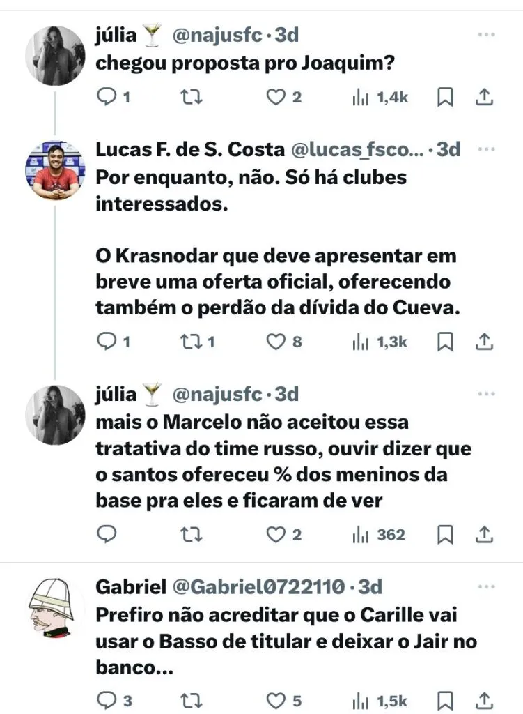E, caso se confirme a saída, atualmente, no elenco santista tem Messias, Jair, Alex, Diego Borges, Zabala e Matheus Mathias como possíveis substitutos. Resta saber qual será a posição da comissão técnica e do departamento de futebol. O Clube segue ativo no mercado, disputando um jogador com o Cruzeiro, time de Ronaldo.