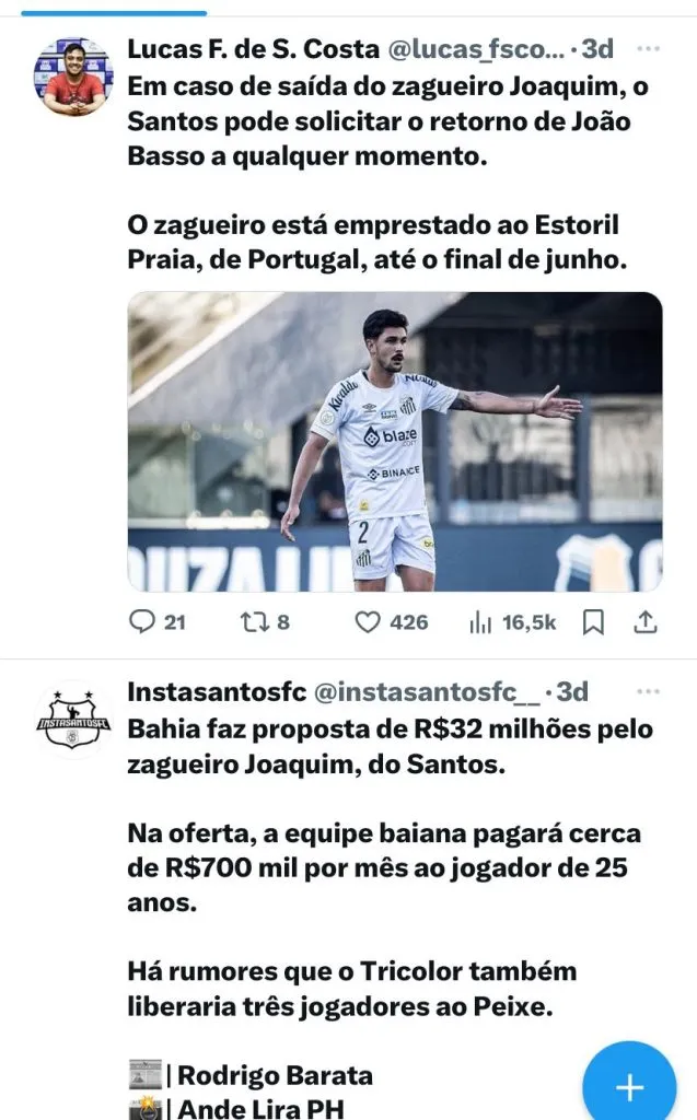Valores que o Santos espera receber por Joaquim
