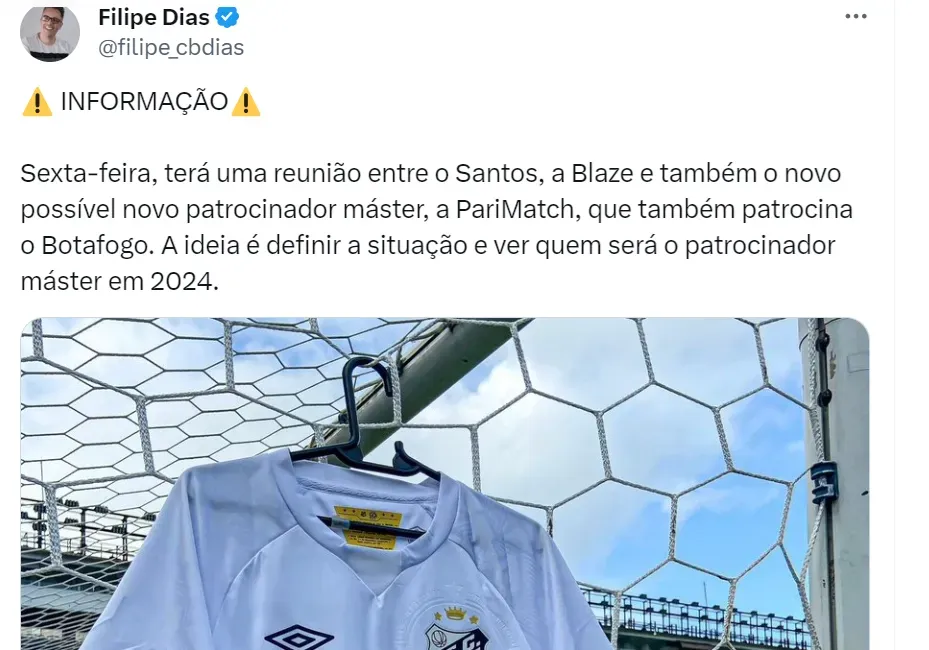 De acordo com o setorista do Peixe, “a reunião será entre o Santos, a Blaze e também o novo possível novo patrocinador máster, a PariMatch, que também patrocina o Botafogo. A ideia é definir a situação e ver quem será o patrocinador máster em 2024”.