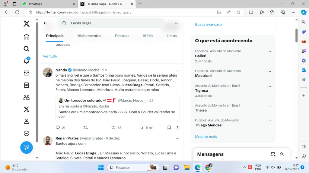Caso contrário, um empréstimo está dentro das possibilidades, afinal Braga tem contrato no Santos até abril de 2026. Na atual temporada, o camisa 30 jogou 42 partidas e marcou um gol.