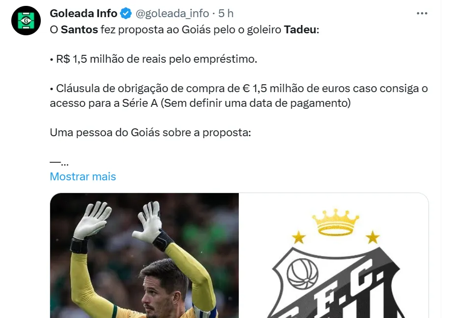 O Santos ofereceu R$ 1,5 milhão ao Goiás para ceder Tadeu por empréstimo ao longo de 2024, em que o Clube disputará o Campeonato Paulista e a Série B. No papel, havia ainda uma cláusula de compra na casa dos R$ 8 milhões.
