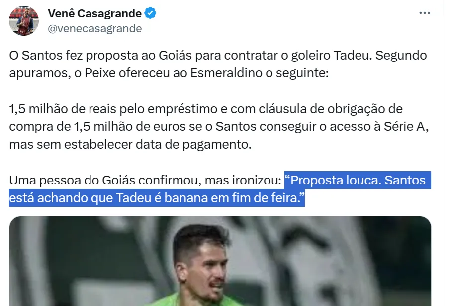 Este valor seria pago ao Goiás em caso de volta do Santos para a Série A em 2025, mas sem data estabelecida. Venê obteve resposta do Esmeraldino: “Proposta louca. O Santos está achando que Tadeu é banana em fim de feira.”