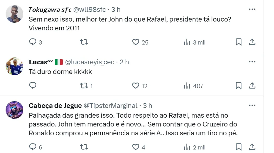 Nossa reportagem confirmou que uma das opções de Marcelo Teixeira é envolver John em definitivo com o Cruzeiro em troca de Rafael Cabral. Ronaldo gosta do ativo alvinegro, o que pode auxiliar no negócio.