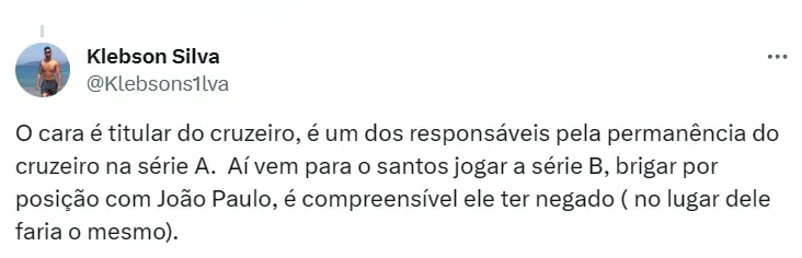 “Quando eu vim para cá (Cruzeiro) me ofereceram um projeto de quatro anos. Estou só no meio do projeto e por mais que eu tenha um carinho e ame muito o Santos, tenho que ser grato ao Cruzeiro”, completou.