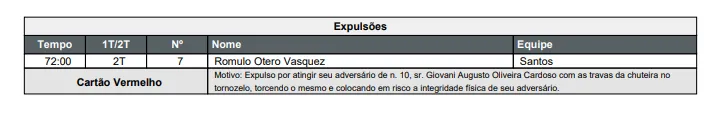 “Expulso por atingir seu adversário de nº 10, sr. Giovani Augusto Oliveira Cardoso, com as travas da chuteira no tornozelo, torcendo o mesmo e colocando em risco a integridade física de seu adversário”, relatou Raphael Claus na súmula do jogo.