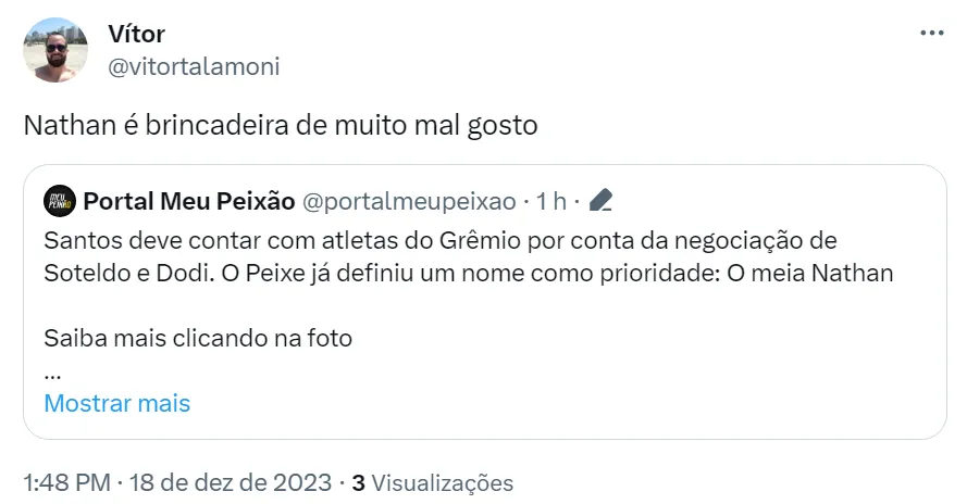 “Já preteriu o Santos uma vez. Não traria”, disse um torcedor na web. “Nathan é brincadeira de muito mal gosto”, apontou outro santista. Resta saber se a pressão das redes sociais vai fazer o Peixe a desistir dessa contratação.