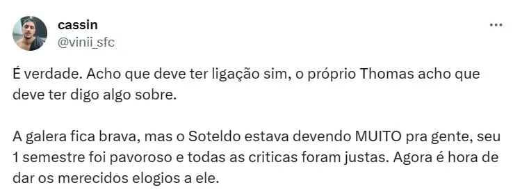 O treinador vem contando, também, com a evolução de alguns jogadores. O próprio Soteldo não vinha desempenhando um bom futebol no primeiro semestre, mas agora é ‘o cara’ do time.