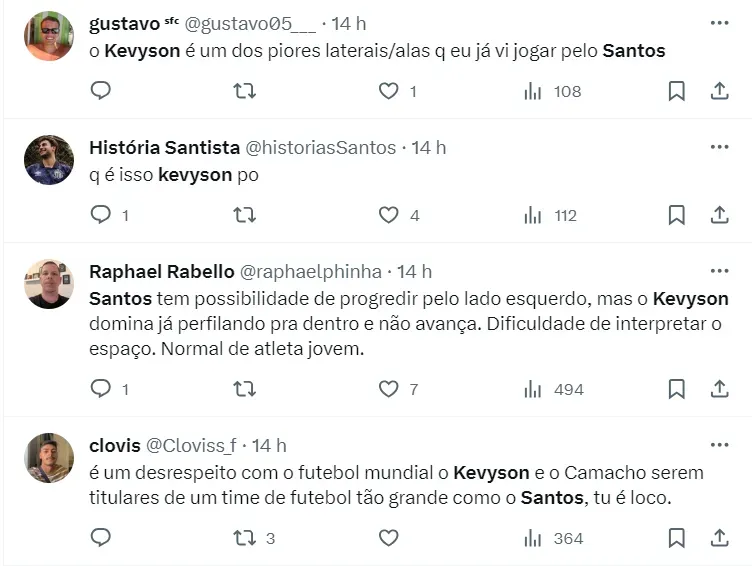 Em defesa do menino da vila, um outro santista apontou que alguns erros são cometidos diante da imaturidade do jogador de apenas 19 anos. “Santos tem possibilidade de progredir pelo lado esquerdo, mas o Kevyson domina já perfilando pra dentro e não avança. Dificuldade de interpretar o espaço. Normal de atleta jovem”, justificou.