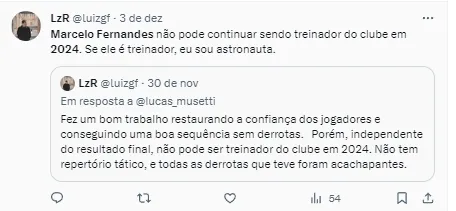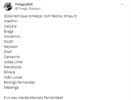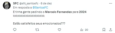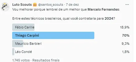 A apuração do colega, que cobre o Santos, deu conta de que o treinador Marcelo Fernandes não seguirá no cargo como comandante para a temporada de 2024. Ele não vai ficar no cargo, pois já não era opção de nenhum dos candidatos à presidência do Clube.