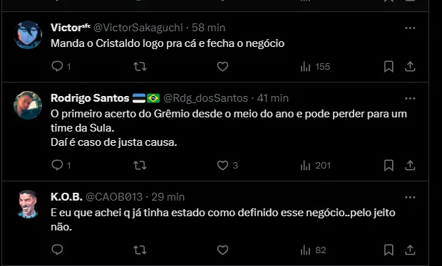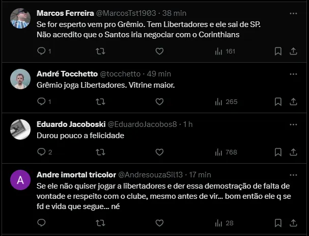 “Corinthians avança por Yeferson Soteldo. Assim como o Grêmio, fez uma oferta pelo talentoso venezuelano que foi rebaixado com o Santos”, disse Germán García em sua rede social.