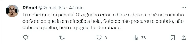 “Falo sobre algo que é inatingível na profissão, que é a perfeição. Falo desse pênalti marcado em Soteldo, em Itaquera. Pênalti que dividiu opiniões e mais do que isso, quem acha que foi pênalti tem certeza absoluta da marcação. E aqueles que não enxergam a falta são totais idiotas. E aqueles que acham que não foi nada, pensam o mesmo, não foi nada e quem acha que foi é contra o Corinthians”.
