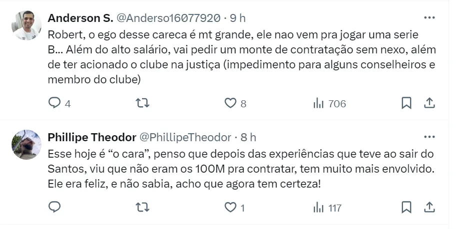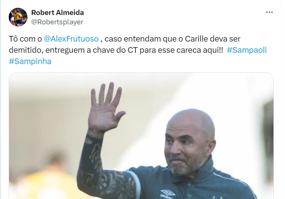 “Caso entendam que o Carille deva ser demitido, entreguem a chave do CT para esse careca aqui!!, escreveu o ídolo santista na rede social do X. O técnico chileno está livre no mercado desde que saiu do Flamengo.