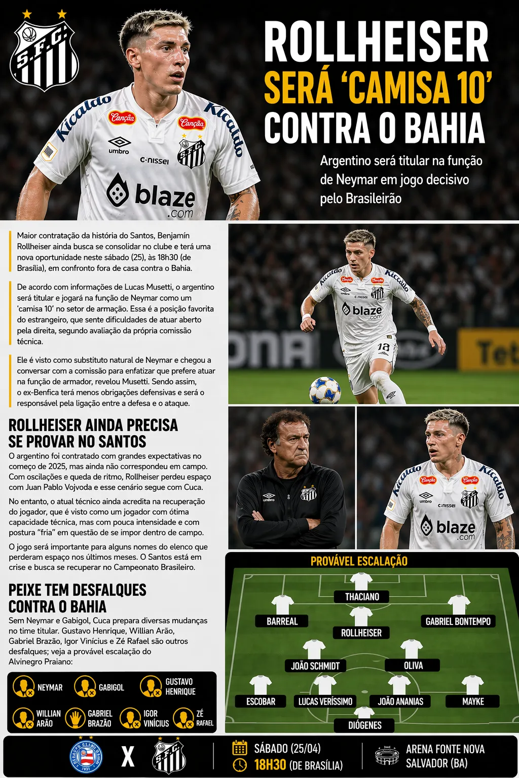 Maior contratação da história do Santos, Benjamín Rollheiser ainda busca se consolidar no clube e terá uma nova oportunidade neste sábado (25), às 18h30 (de Brasília), em confronto fora de casa contra o Bahia.