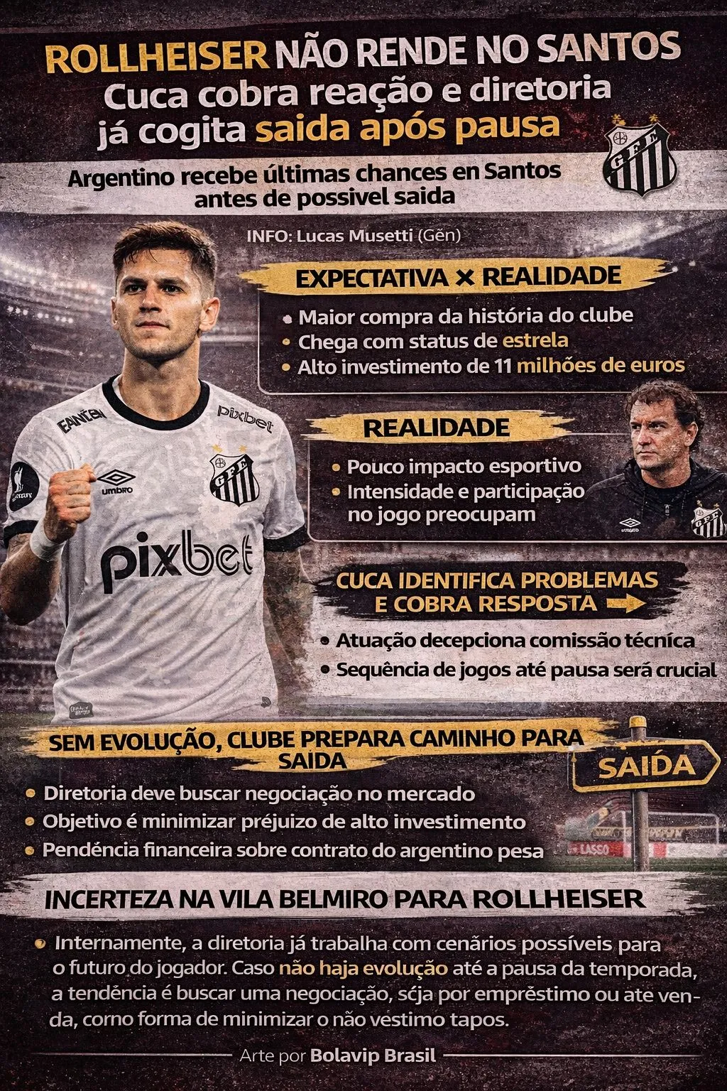 O Santos vive um momento de forte atenção com Benjamín Rollheiser, contratação mais cara da história do clube. Apesar da expectativa criada, o meia ainda não conseguiu se firmar e o desempenho abaixo do esperado já começa a gerar incômodo interno, aumentando a pressão por uma resposta mais consistente dentro de campo nas próximas partidas.