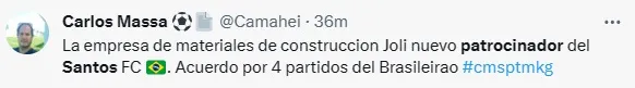 O Santos anunciou nesta sexta-feira (6) a adição de um novo patrocinador pontual para as próximas quatro partidas do Campeonato Brasileiro. A Joli, uma rede de lojas de material para construção, terá sua marca estampada na camisa do clube.