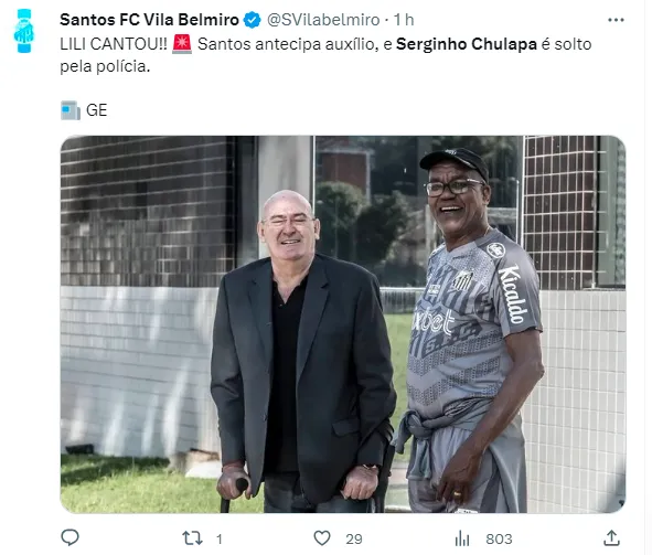 De acordo com o Globo Esporte, o valor do débito era de R$ 25,8 mil. Dessa forma, o ex-jogador e que também foi auxiliar da comissão técnica do Peixe até agosto do ano passado, deixou a cadeia na noite da última quarta-feira (13). É notório que o Alvinegro Praiano teve uma participação decisiva para que Serginho Chulapa esteja agora em liberdade. Ele trabalhou com treinadores como Fábio Carille, Fabián Bustos e Lisca no Alvinegro Praiano.