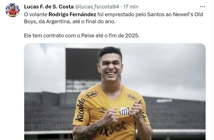 Em nota oficial à imprensa, o Peixe informou que aceitou emprestar o meio-campista Rodrigo Fernández, que estava fora dos planos de Fábio Carille, para o Newell’s Old Boys, da Argentina, até dezembro.