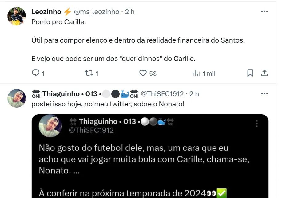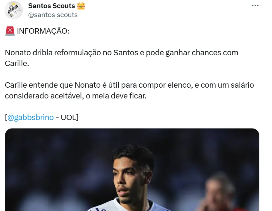 Nonato terminou a temporada em alta no Santos e tomou o lugar de Lucas Lima, que não ficará em 2024. Carille entende que o camisa 7 será útil no elenco, juntamente de Giuliano, Cazares e Otero.