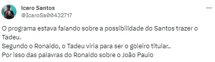 Tadeu é um nome que vem se destacando no futebol brasileiro nos últimos anos. Vale destacar que ele seria um nome para ser reserva de João Paulo em um primeiro momento, porém, o camisa 34 é alvo de muitas especulações dentro da Vila Belmiro.