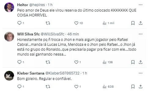 “Matheus Cavichioli, ex América-MG, é um dos nomes estudados pelo Santos para chegar em 2024… Tadeu e Rafael Cabral são prioridades, mas são vistos como difíceis neste momento”, publicou o perfil De Olho no Peixe.