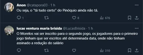 Por fim, na chamada lista “B”, o Peixe colocou somente o goleiro Rodrigo Falcão, o zagueiro Jair, o lateral Kevyson e o atacante Wesley Patati. Não à toa, o tema envolvendo Morelos gerou incógnitas no torcedor.