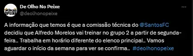 “A informação que temos é que a comissão técnica decidiu que Alfredo Morelos vai treinar no grupo 2 a partir de segunda-feira. Trabalha em horário diferente do elenco principal. Vamos aguardar o início da semana para ver se confirma”, informou o perfil De Olho no Peixe.