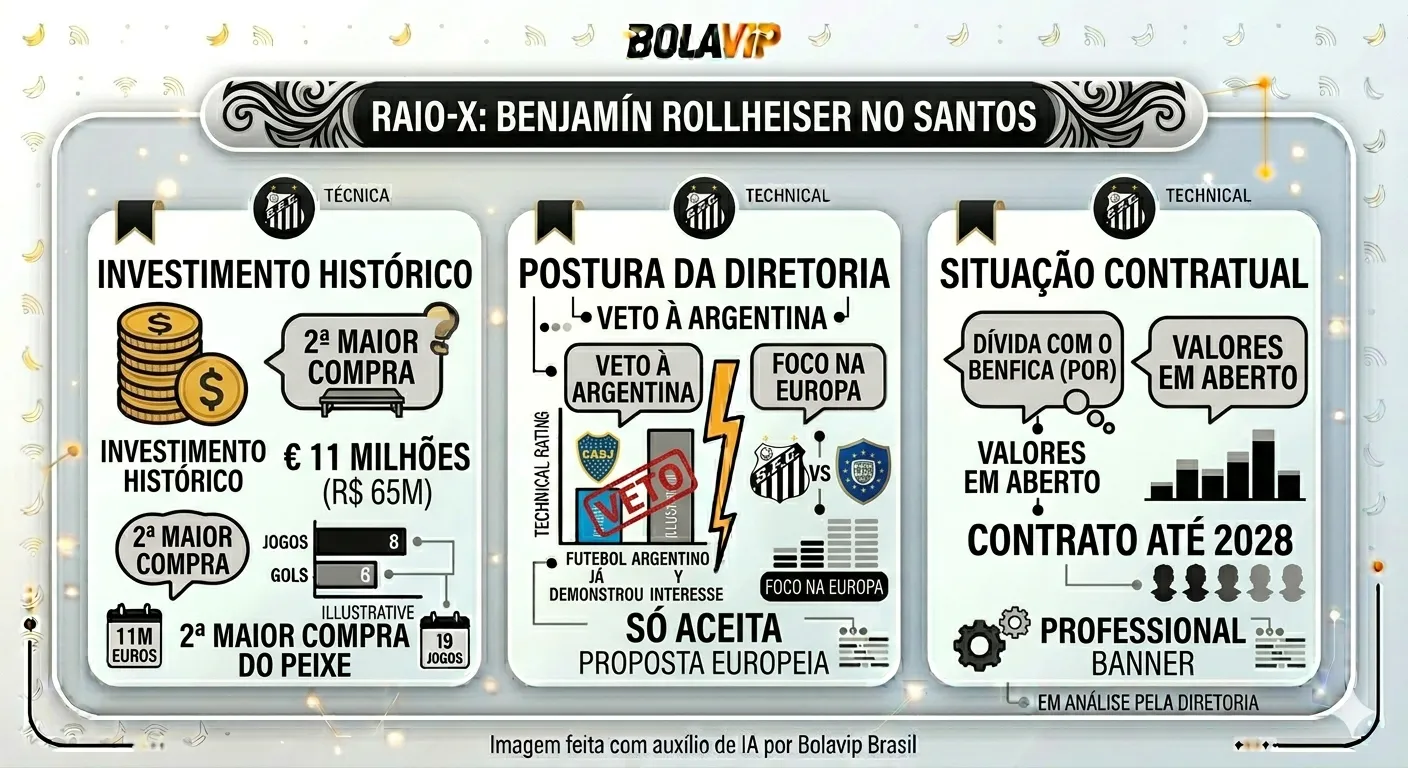 Rollheiser custou em 2025 junto ao Benfica cerca de 11 milhões de euros (R$ 65 milhões na época) e o Peixe ainda deve uma quantia aos portugueses. Se algum clube europeu oferecer valores próximos ao que ele foi contratado, o Alvinegro topa fazer negócio para diminuir o prejuízo.