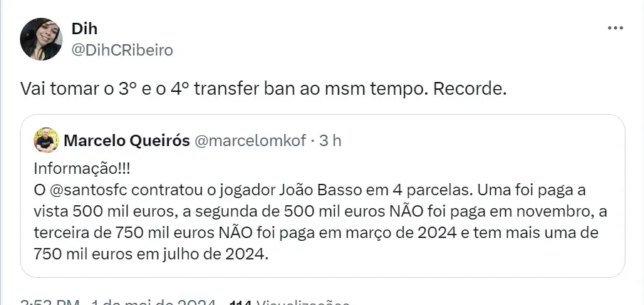 Porém, em novembro de 2023, o dirigente já deixou de pagar a segunda parcela em 500 mil euros, como explicou Marcelo Queirós, do canal Comando Alvinegro. O presidente Marcelo Teixeira, por sua vez, em março deste ano deixou pagar aos portugueses 750 mil euros.