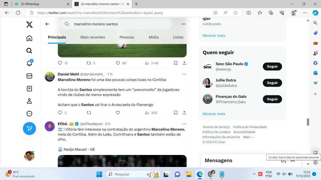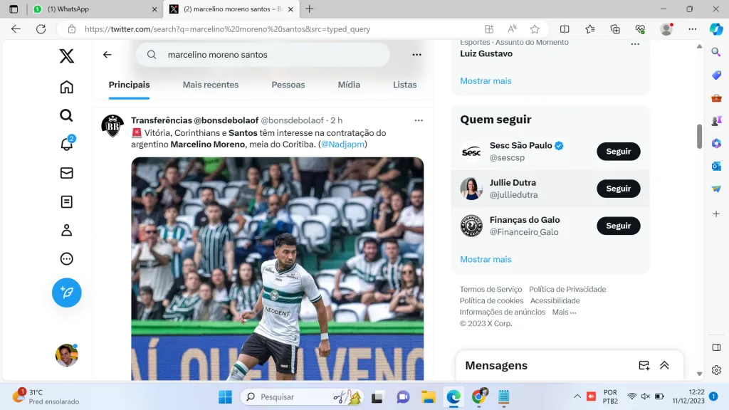 Ainda assim, começam a brotar possíveis nomes para reforçar o elenco alvinegro desde o Campeonato Paulista. A jornalista Nadja Mauad, do Globo Esporte, informou que o meia argentino Marcelino Moreno, do Coritiba, está na mira do Peixe.