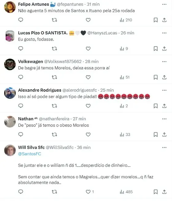 “Diretoria do Santos trabalha com o nome de Alexandre Pato como possibilidade para a temporada de 2024. Os moldes da negociação não foram informados, mas tem o aval do técnico Fábio Carille. Exames devem ser feitos para avaliar as condições físicas de Pato antes de avanço“, escreveu Caique Silva.