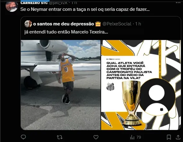 Tudo começou com um post do Santos a tarde revelando que um jogador entrará em campo com a taça do Campeonato Paulista. “Qual atleta você acha que entrará com o troféu do Paulista antes do início da partida na Vila?”, escreveu o Peixe.